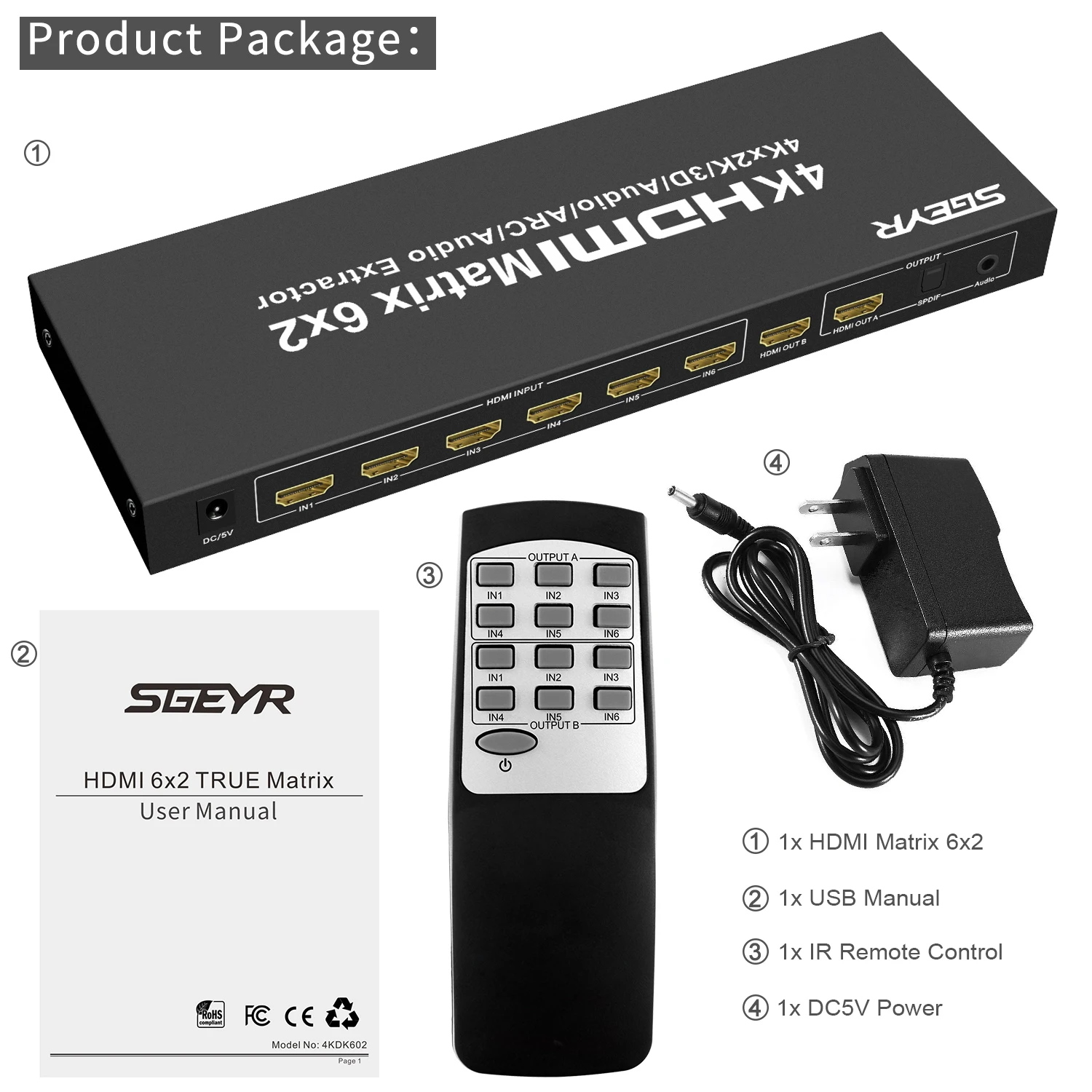 Product Name: Przełącznik 6x2 macierz hdmi 4K x 2K 6 in 2 out macierz hdmi monitory przełącznik Splitter z pilotem SPDIF + 3.5mm ekstraktor audio
